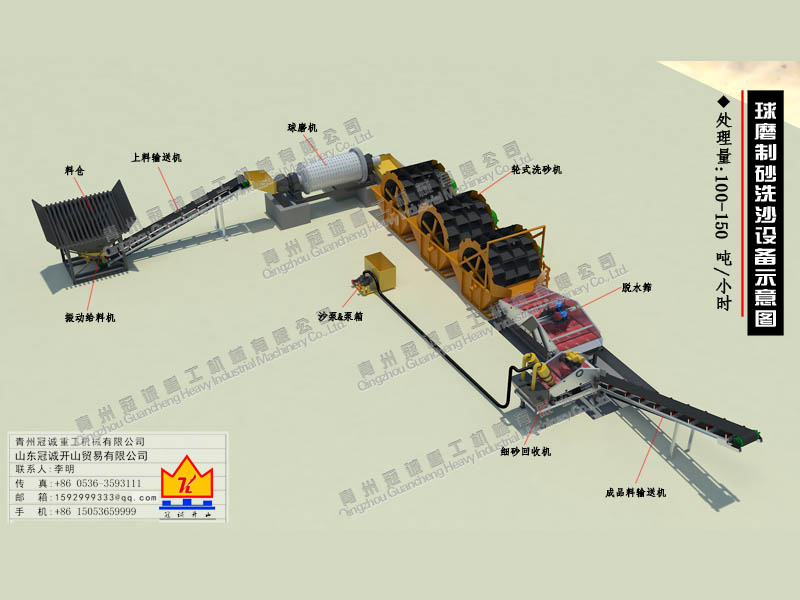 球磨制砂機(jī)生產(chǎn)流程:裝載機(jī)——大料斗——上料帶——球磨式制砂機(jī)——清淤池——挖斗式洗砂機(jī)——清淤池——輪斗式洗砂機(jī)——出料帶——細(xì)沙回收脫水——成品打堆。