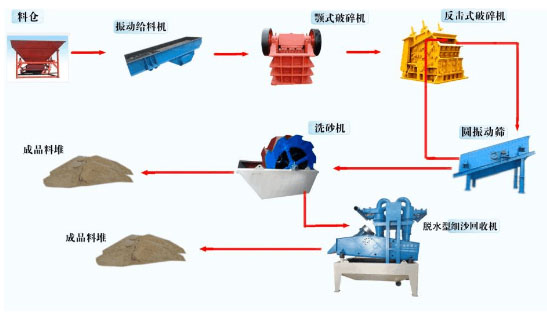 對(duì)于一套完整的水洗砂生產(chǎn)線來說,其除了包含有洗砂機(jī)這一核心洗砂設(shè)備外,其肯定還會(huì)含有制砂機(jī),甚至還有粗、細(xì)碎破碎機(jī)(通常情況下,多為顎式破碎機(jī)與反擊式破碎機(jī)),用于完成對(duì)大塊砂石物料的粗、細(xì)碎作業(yè)。具體各設(shè)備之間配合生產(chǎn)工藝流程如下: