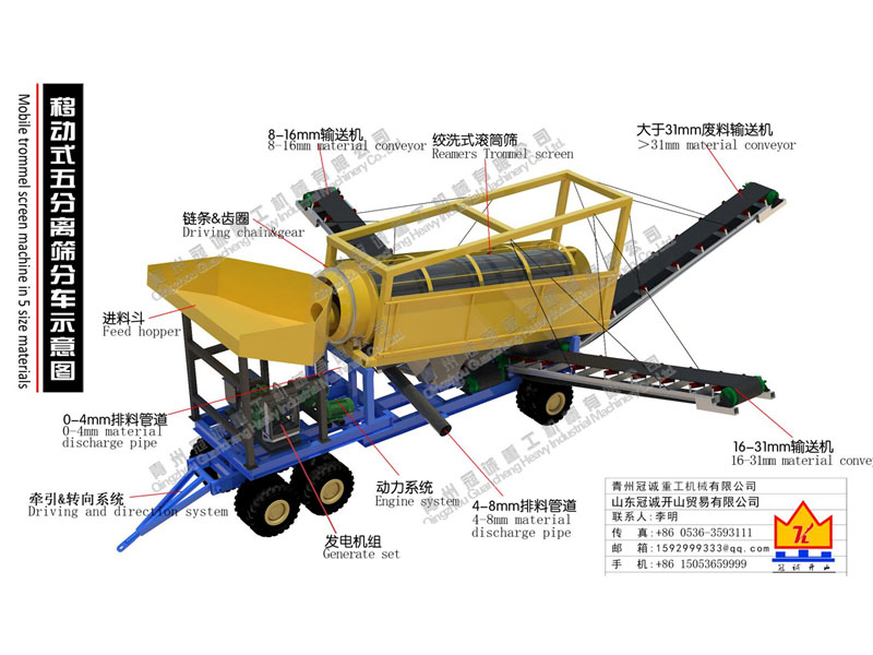 移動式五分離篩分設(shè)備,發(fā)電機(jī)組集成在底盤上,附帶牽引&轉(zhuǎn)向系統(tǒng),可以使用牽引車輛輕松移動至工作場地;其中篩分系統(tǒng)使用了新型核心技術(shù)的絞洗式滾筒篩,其優(yōu)勢如下:
